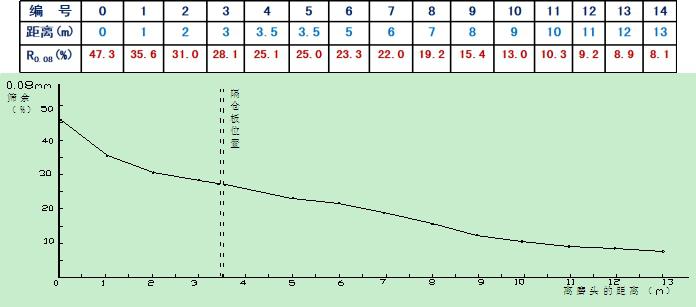 把每個取樣點取得的試樣混合均勻后,作為該取樣點的平均試樣并編好號,防止搞錯,用0.08mm篩分別進(jìn)行篩析,測得各段的篩余百分?jǐn)?shù);然后以縱坐標(biāo)為測出的篩余%(細(xì)度),橫坐標(biāo)為取樣點離磨頭的距離(m),把篩析數(shù)據(jù),標(biāo)記在坐標(biāo)圖上、聯(lián)線,即為磨內(nèi)篩析曲線。