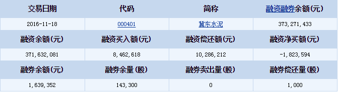 冀東水泥(000401)2016-11-18融資融券信息顯示,冀東水泥融資余額371,632,081元,融券余額1,639,352元,融資買入額8,462,618元,融資償還額10,286,212元,融資凈買額-1,823,594元,融券余量143,300股,融券賣出量0股,融券償還量1,000股,融資融券余額373,271,433元。冀東水泥融資融券詳細信息如下表: