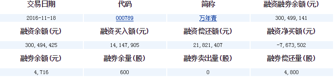 萬年青(000789)2016-11-18融資融券信息顯示,萬年青融資余額300,494,425元,融券余額4,716元,融資買入額14,147,905元,融資償還額21,821,407元,融資凈買額-7,673,502元,融券余量600股,融券賣出量0股,融券償還量4,800股,融資融券余額300,499,141元。萬年青融資融券詳細信息如下表: