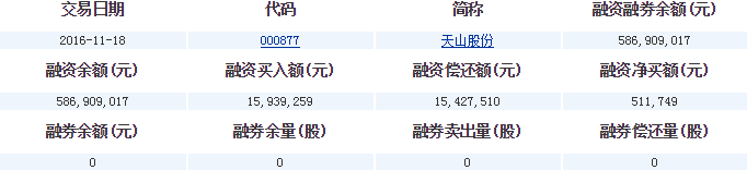 天山股份(000877)2016-11-18融資融券信息顯示,天山股份融資余額586,909,017元,融券余額0元,融資買入額15,939,259元,融資償還額15,427,510元,融資凈買額511,749元,融券余量0股,融券賣出量0股,融券償還量0股,融資融券余額586,909,017元。天山股份融資融券詳細(xì)信息如下表: