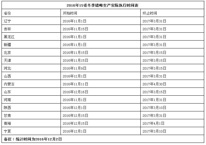 各地各企業(yè)對錯峰生產的重視達到了前所未有的程度,所涉及省市自治區(qū)馬上行動,很快根據(jù)各自情況,因地制宜出臺實施文件,拿出了操作性極強的措施,有的地區(qū)甚至細化到點明哪一家企業(yè)的哪一條生產線應該關停。與此同時,各地的文件都部署了詳細的保障執(zhí)法措施和督查追責辦法。到目前為止,已經落實2016年15省冬季錯峰生產實際執(zhí)行時間表: