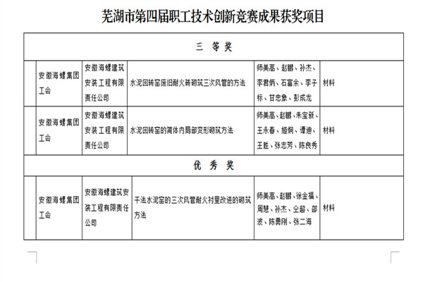 近日,蕪湖市總工會(huì)、蕪湖市科學(xué)技術(shù)局、蕪湖市發(fā)明協(xié)會(huì)等三家單位聯(lián)合組織開(kāi)展了職工技術(shù)創(chuàng)新競(jìng)賽活動(dòng),海螺建安公司首次參加此項(xiàng)活動(dòng),申報(bào)三個(gè)項(xiàng)目全部獲獎(jiǎng)。