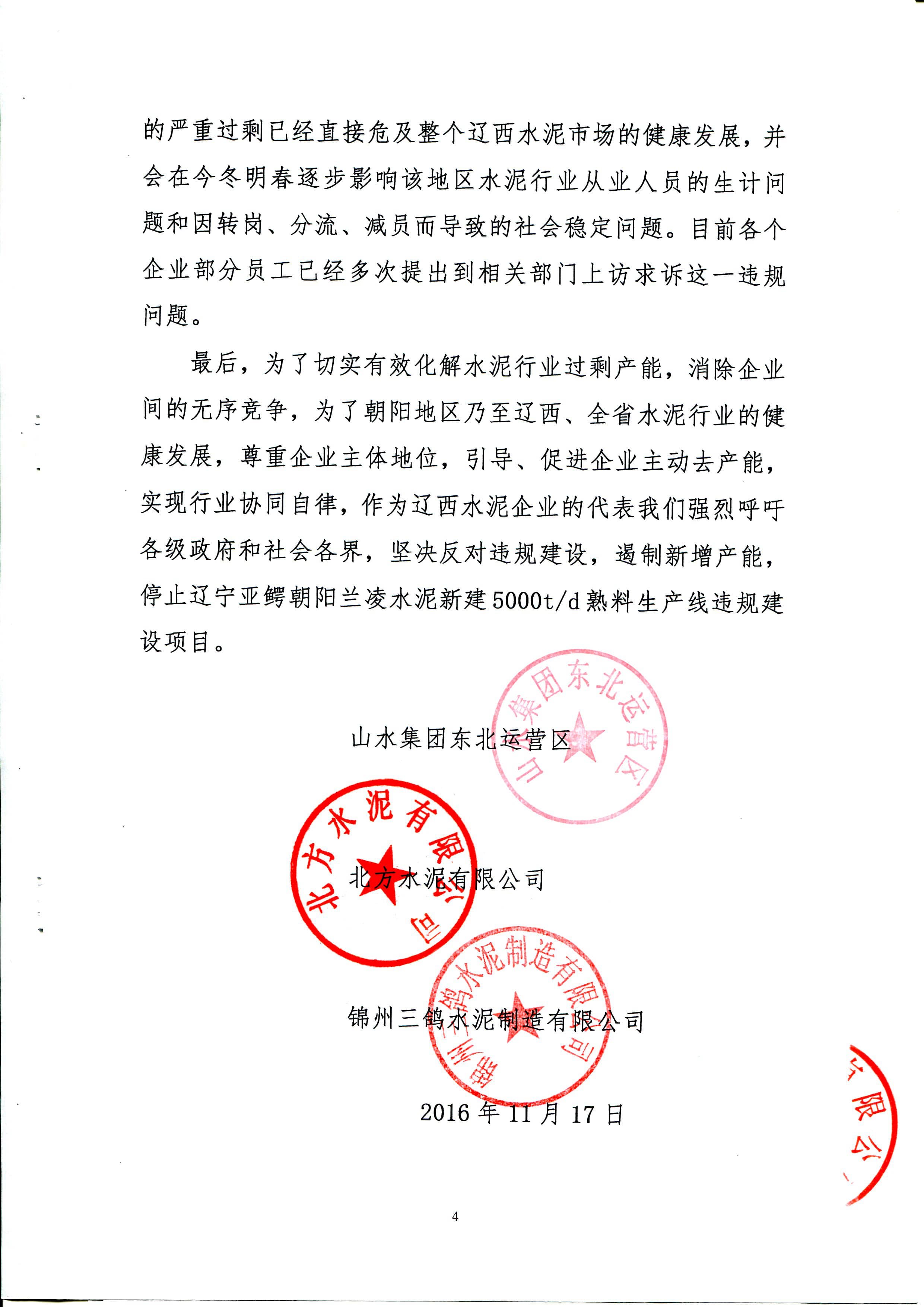 山水水泥、北方水泥、三鴿水泥、遼寧建材協(xié)會聯(lián)名舉報蘭凌水泥違規(guī)建線