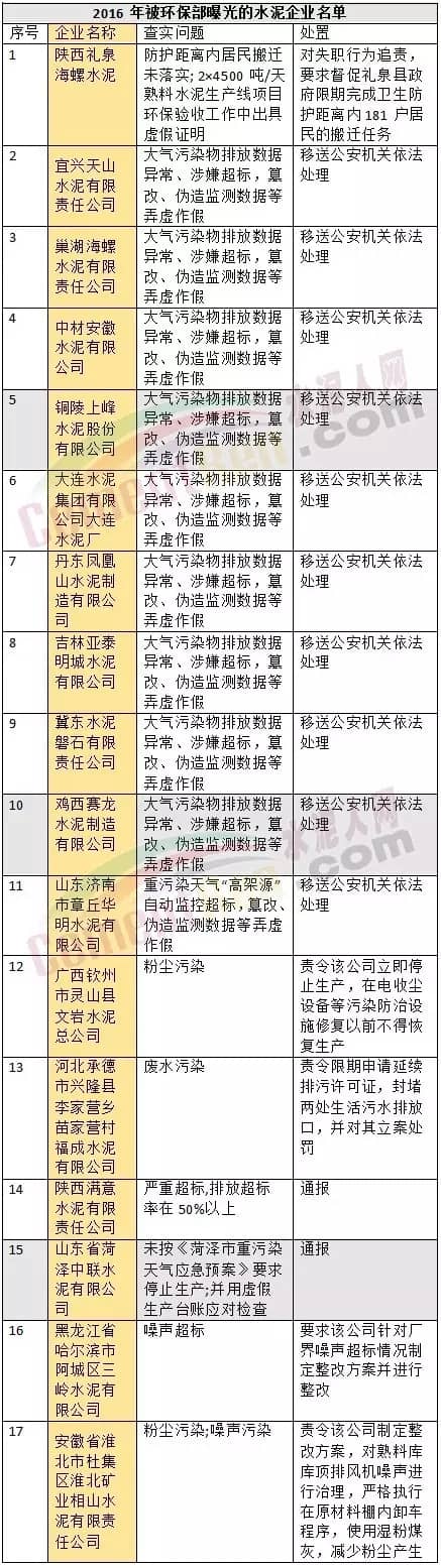 環(huán)保督察的高調(diào)執(zhí)行,一方面加強了督察的力度和聲勢,悍衛(wèi)了環(huán)保法的權(quán)威;另一方面也曝光了企業(yè)的一些問題。這些問題在督察中暴露,能夠迫使地方政府主要負(fù)責(zé)人下決心解決。被環(huán)保部曝光的17家水泥企業(yè),列表如下: