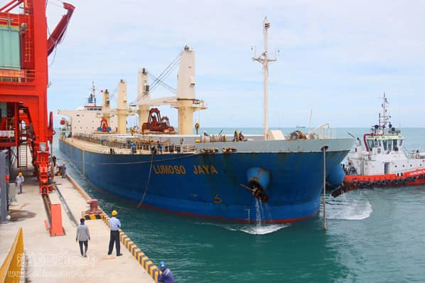 2017年1月12日上午12時18分,伴隨著喜慶的鞭炮聲,來自西巴公司滿載53000噸熟料船在碼頭成功靠泊,標(biāo)志著孔雀港五萬噸級碼頭正式投入使用。