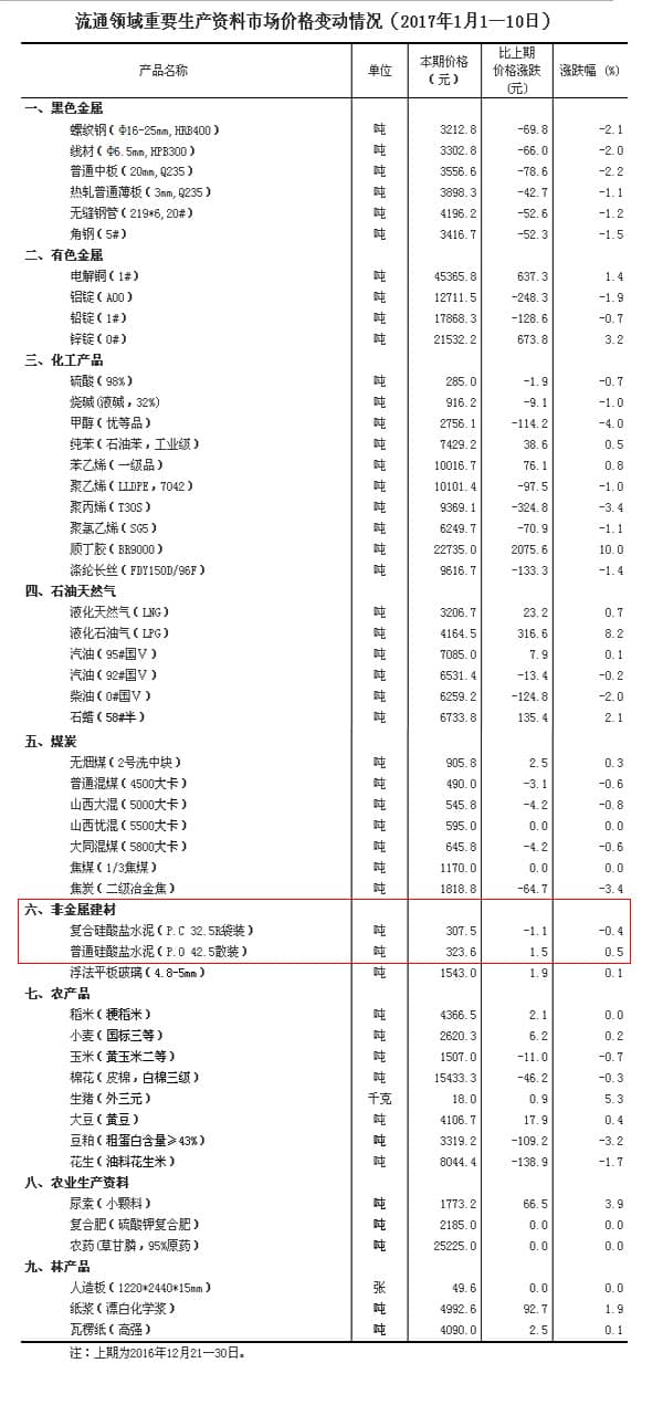 流通領域重要生產(chǎn)資料市場價格變動情況(2017年1月1-10日) 國家統(tǒng)計局