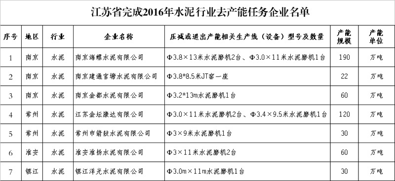 根據(jù)《省政府關(guān)于供給側(cè)結(jié)構(gòu)性改革去產(chǎn)能的實(shí)施意見(jiàn)》(蘇政發(fā)〔2016〕50號(hào))和《省政府辦公廳關(guān)于印發(fā)江蘇省水泥平板玻璃船舶行業(yè)去產(chǎn)能工作實(shí)施方案》精神,省、市經(jīng)信委組織對(duì)2016年水泥、平板玻璃、船舶等重點(diǎn)行業(yè)承擔(dān)去產(chǎn)能任務(wù)企業(yè)任務(wù)完成情況進(jìn)行了考核驗(yàn)收。經(jīng)現(xiàn)場(chǎng)核查,有關(guān)企業(yè)均在規(guī)定的時(shí)限內(nèi)完成了年度去產(chǎn)能目標(biāo)任務(wù),現(xiàn)將有關(guān)企業(yè)名單予以公告,接受社會(huì)各界監(jiān)督。如有異議,請(qǐng)與省經(jīng)信委或省紀(jì)委駐省經(jīng)信委紀(jì)檢組聯(lián)系。