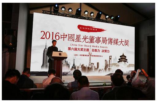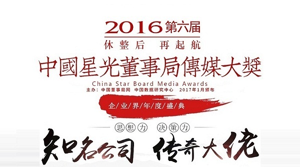 2017年1月19日,被譽(yù)為中國企業(yè)董事會最高榮譽(yù)獎項(xiàng)的2016第六屆“中國星光董事局傳媒大獎”在北京隆重揭曉。本屆大獎以思想力和決策力為主題,力圖展現(xiàn)大時(shí)代背景下,中國領(lǐng)袖企業(yè)者對未來和趨勢的前瞻性思考。