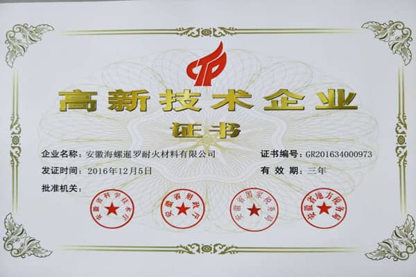 為積極爭取國家相關(guān)優(yōu)惠政策、實現(xiàn)公司效益最大化,進(jìn)一步提升企業(yè)的美譽(yù)度和市場競爭力,并以高新技術(shù)企業(yè)的申報為契機(jī),進(jìn)一步推進(jìn)公司技術(shù)研發(fā)和管理創(chuàng)新工作、提升公司的綜合競爭力,耐火材料公司積極開展高新技術(shù)企業(yè)申報工作,于2016年12月順利通過國家高新技術(shù)企業(yè)認(rèn)定,并于2017年元月取得高新技術(shù)企業(yè)證書,成為安徽省2016年第二批高新技術(shù)企業(yè),這是耐火材料發(fā)展史上的又一里程碑。