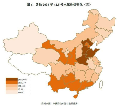 從各省2016年水泥價(jià)格變化方面看,河北水泥價(jià)格漲幅全國(guó)居首,達(dá)220元,山東、河南在四季度錯(cuò)峰執(zhí)行后價(jià)格亦有明顯增長(zhǎng),整體看納入統(tǒng)計(jì)的30個(gè)地區(qū)中40%地區(qū)漲幅超過100元,33%地區(qū)水泥價(jià)格漲幅在50~100元區(qū)間,僅新疆水泥價(jià)格較2015年末有所下降。