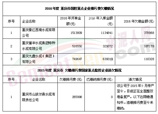 近日,重慶環(huán)保局公布了2015年以及2016年共4家國(guó)家重點(diǎn)監(jiān)控水泥企業(yè)排污費(fèi)欠繳清理情況,這4家企業(yè)合計(jì)欠費(fèi)94.24萬元(見下表),其中重慶綦江西南水泥有限公司2016年欠繳378968元,屬欠費(fèi)金額最大的水泥企業(yè)。而重慶市山拔爾桑水泥有限責(zé)任公司,至2015年開始一直拖欠排污費(fèi)265998元至今,屬拖欠時(shí)間較長(zhǎng)的水泥企業(yè)。