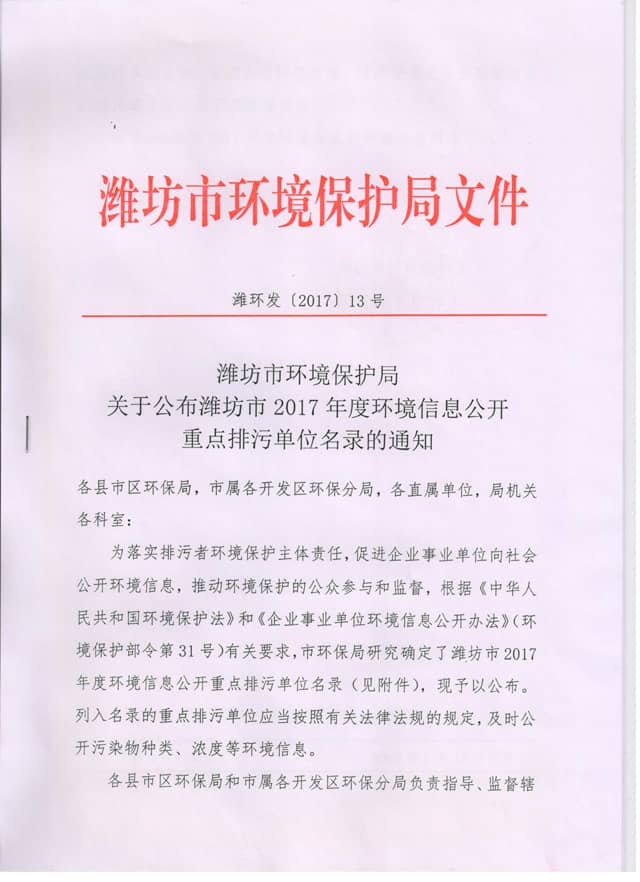近日,濰坊市環(huán)保局對外正式公布《2017 年濰坊市環(huán)境信息公開重點排污單位名單》。據(jù)悉,該名單的公布是濰坊市環(huán)保局為積極落實排污者環(huán)境保護(hù)主體責(zé)任,促進(jìn)企業(yè)事業(yè)單位向社會公開環(huán)境信息,推動環(huán)境保護(hù)的公眾參與和監(jiān)督,依據(jù)《中華人民共和國環(huán)境保護(hù)法》和《企業(yè)事業(yè)單位環(huán)境信息公開辦法》的有關(guān)要求面向全社會公布的。濰坊各縣市區(qū)共計189家企業(yè)事業(yè)單位被列入名單。