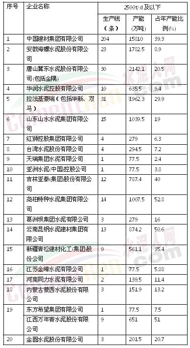 表2: 2016年熟料產(chǎn)能前20強(qiáng)2500t/d及以下生產(chǎn)線產(chǎn)能占比表