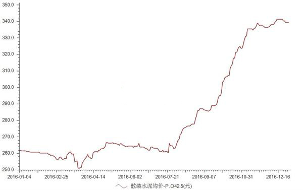 全國水泥市場平均價格自2014年連續(xù)兩年持續(xù)下行,至2016年初探底后開始持續(xù)回升,尤其是8月份以后,價格更是直線攀升。2016年全國P.O42.5散裝水泥市場價格由年初最低降至244元/噸,至12月份已回升至337元/噸,總計上漲了93元/噸,漲幅達37%。
