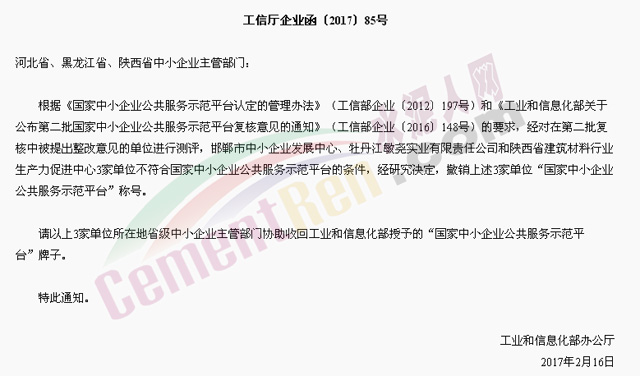 根據(jù)《國家中小企業(yè)公共服務(wù)示范平臺認(rèn)定的管理辦法》(工信部企業(yè)〔2012〕197號)和《工業(yè)和信息化部關(guān)于公布第二批國家中小企業(yè)公共服務(wù)示范平臺復(fù)核意見的通知》(工信部企業(yè)〔2016〕148號)的要求,經(jīng)對在第二批復(fù)核中被提出整改意見的單位進(jìn)行測評,邯鄲市中小企業(yè)發(fā)展中心、牡丹江敏堯?qū)崢I(yè)有限責(zé)任公司和陜西省建筑材料行業(yè)生產(chǎn)力促進(jìn)中心3家單位不符合國家中小企業(yè)公共服務(wù)示范平臺的條件,經(jīng)研究決定,撤銷上述3家單位“國家中小企業(yè)公共服務(wù)示范平臺”稱號。