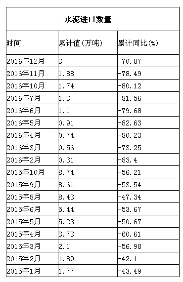 相關數(shù)據(jù)庫數(shù)據(jù)顯示,2016年我國水泥進口數(shù)量累計3萬噸,累計同比下降70.87%,進口量持續(xù)大幅下跌,也進一步反映了國內水泥產(chǎn)能過剩矛盾突出問題。
