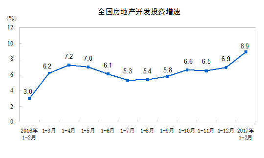 2017年1-2月份,全國房地產(chǎn)開發(fā)投資9854億元,同比名義增長8.9%,增速比去年全年提高2個百分點。其中,住宅投資6571億元,增長9.0%,增速提高2.6個百分點。住宅投資占房地產(chǎn)開發(fā)投資的比重為66.7%。