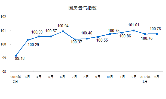 2月份,房地產(chǎn)開發(fā)景氣指數(shù)(簡稱“國房景氣指數(shù)”,今年起發(fā)布的是基期修定后的值)為100.78,比1月份提高0.02點。