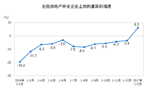 1-2月份,房地產(chǎn)開發(fā)企業(yè)土地購置面積2374萬平方米,同比增長6.2%,去年全年為下降3.4%;土地成交價款794億元,增長12.7%,增速回落7.1個百分點。