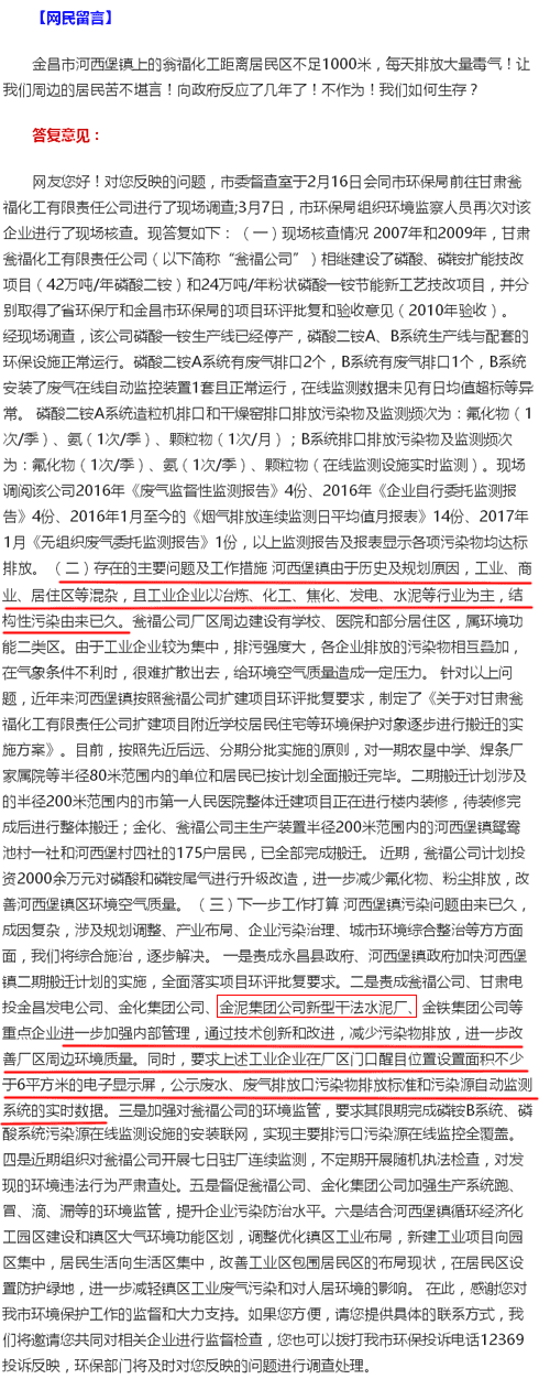 官方回復(fù)中提到了當(dāng)?shù)氐?a href="http://www.piarcos.com/news/list_2.html" target="_blank" class="keylink">水泥企業(yè)——金泥集團(tuán)公司新型干法水泥廠,要求企業(yè)進(jìn)一步加強(qiáng)內(nèi)部管理,通過技術(shù)創(chuàng)新和改進(jìn),減少污染物排放,進(jìn)一步改善廠區(qū)周邊環(huán)境質(zhì)量。同時,要求企業(yè)在廠區(qū)門口醒目位置設(shè)置面積不少于6平方米的電子顯示屏,公示廢水、廢氣排放口污染物排放標(biāo)準(zhǔn)和污染源自動監(jiān)測系統(tǒng)的實(shí)時數(shù)據(jù)。 ”,由此可見當(dāng)?shù)卣卫砦廴镜臎Q心和力度。