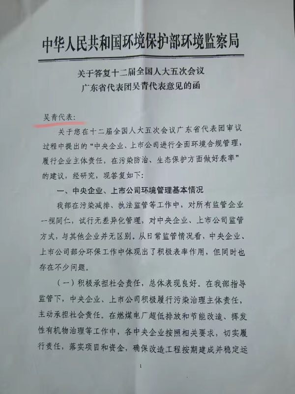 “我覺得環(huán)保部這么快做回復(fù),首先說明環(huán)保部對人大代表意見的重視,對央企、上市公司環(huán)境管理工作的重視,也體現(xiàn)了環(huán)境監(jiān)察局工作的效率和執(zhí)行力。我完全認(rèn)同回復(fù)中的觀點(diǎn)。”吳青說道。