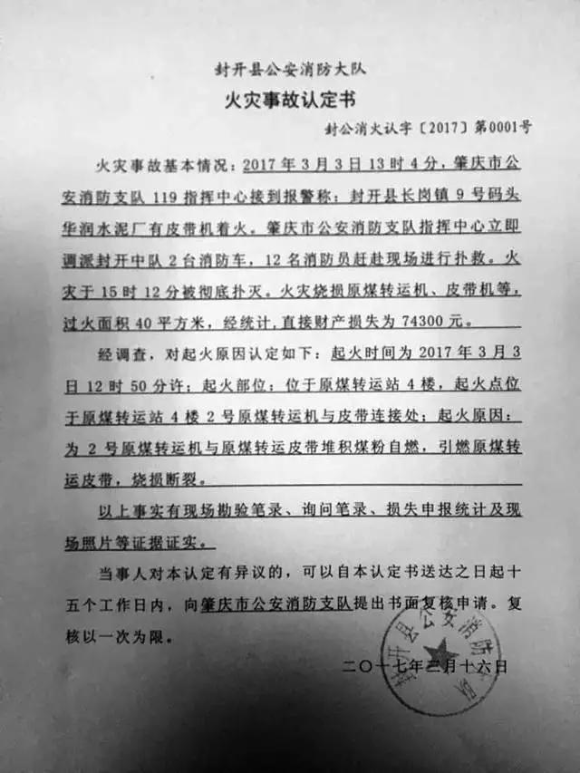 華潤水泥(封開)有限公司所在地肇慶市封開縣公安消防大隊已于昨日(3月16日)出具了火災(zāi)事故認(rèn)定書(封公消火認(rèn)字[2017]第0001號)事故認(rèn)定書描述的起火原因為:2號原煤轉(zhuǎn)運機與原煤轉(zhuǎn)運皮帶堆積煤粉自燃,引燃原煤轉(zhuǎn)運皮帶,燒損斷裂?;馂?zāi)燒損原煤轉(zhuǎn)運機、皮帶機等,過火面積40平方米,直接財產(chǎn)損失為74300元。