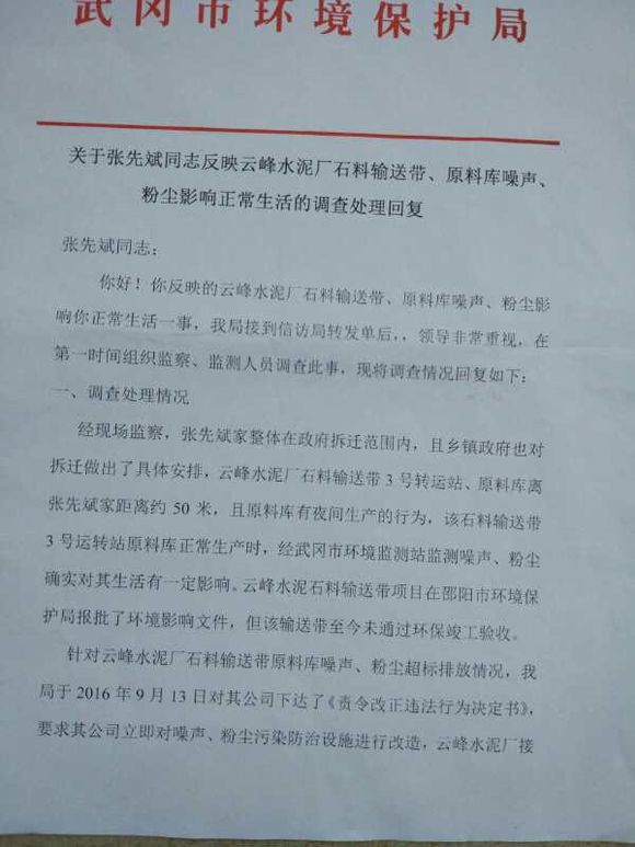 由于受武岡云峰水泥廠刺耳的噪聲和粉塵影響,我和我的家人心煩意亂、情緒緊張、頭昏腦脹,無法正常入睡,導(dǎo)致血壓升高,引發(fā)多種疾病,身體狀況不斷惡化。忍無可忍之下,我四處奔波,多次請求環(huán)保部門出面處理。2016年12月19日,武岡市環(huán)保局終于作出了《關(guān)于張先斌同志反映云峰水泥廠石料輸送帶、原料庫噪聲、粉塵影響正常生活的調(diào)查處理回復(fù)》(見圖三和圖四),承認石料輸送帶、原料庫與我家約50米,且對我家的生活造成一定的影響;經(jīng)過整改,仍未達到國家的排放標(biāo)準(zhǔn)。為此,環(huán)保局做出了以下三個處理決定。然而,該處理決定問題太多,我們無法接受。