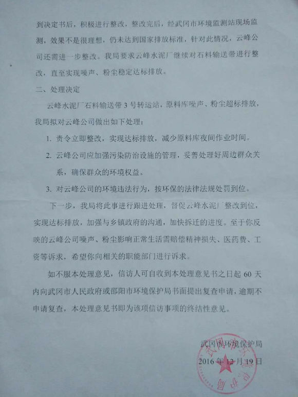 第三個決定是對云峰水泥廠的環(huán)境違法行為,“按環(huán)保的法律法規(guī)處罰到位”。2016年9月13日,環(huán)保局就下達了《責(zé)令改正違法行為決定書》,然后,至今都未有效改正其違法行為。我們懷疑環(huán)保局的執(zhí)法力度。而且,到底如何處罰云峰水泥廠的,我們有權(quán)知道。