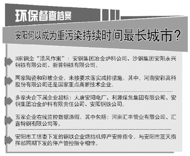 安鋼集團冶金爐料公司在安陽市啟動一級重污染天氣嚴格管控情況下,夜間污染物排放量明顯增大,存在超排現(xiàn)象;沙鋼集團安陽永興鋼鐵有限公司的重污染天氣應(yīng)急管控預(yù)案中I級響應(yīng)措施未達到50%的限產(chǎn)要求;安陽新南亞陶瓷有限公司未按要求落實減排措施;河南安彩高科股份有限公司重污染天氣應(yīng)急管控限產(chǎn)措施沒有具體到生產(chǎn)車間和一線工段,無投料、產(chǎn)量的量化指標,未嚴格落實30%的限產(chǎn)措施;新普鋼鐵有限公司2月6日未嚴格執(zhí)行安陽市藍天工程指揮部管控停產(chǎn)通知要求,正常生產(chǎn)。