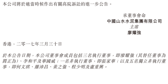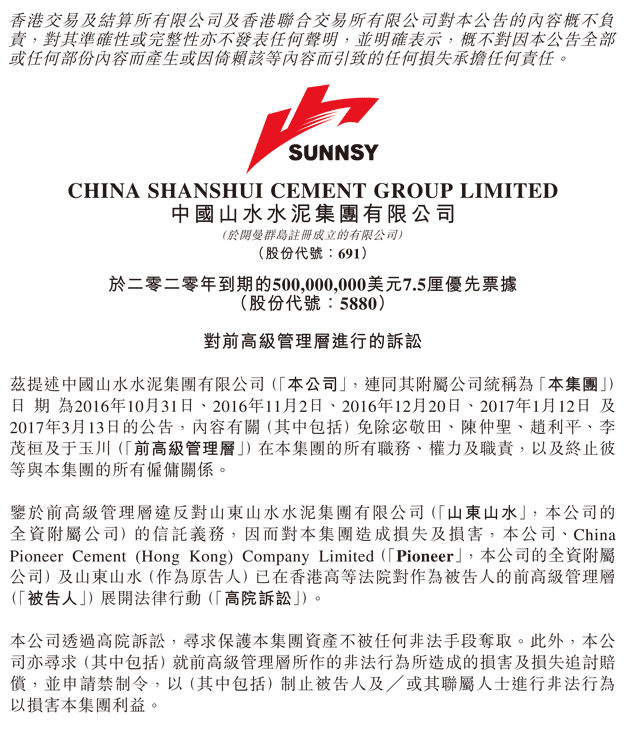 鑒于前高級(jí)管理層違反對(duì)公司全資附屬公司山東山水的信托義務(wù),因而對(duì)集團(tuán)造成損失及損害,公司、全資附屬公司China Pioneer Cement (Hong Kong) Company Limited及山東山水(作為原告人)已在香港高等法院對(duì)作為被告人的前高級(jí)管理層展開(kāi)法律行動(dòng)。