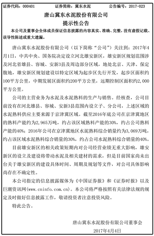 冀東水泥回應(yīng):公司在京津冀區(qū)域水泥銷售價(jià)格上漲,對(duì)公司利潤(rùn)影響暫無(wú)法做定量判斷,但有一定正向影響;因目前國(guó)家尚未出臺(tái)關(guān)于雄安新區(qū)的建設(shè)具體時(shí)間、周期及規(guī)劃等文件,對(duì)公司具體影響尚存在不確定性;公司目前沒(méi)有在河北雄縣、容城、安新3縣范圍內(nèi)設(shè)立子、分公司。