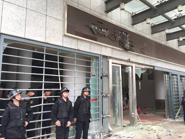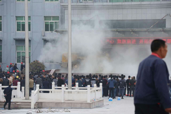 由于辦公樓外有鋼結(jié)構(gòu)大門,來者未能第一時(shí)間破門。“大概僵持了兩個(gè)小時(shí)左右,他們搶奪了廠區(qū)內(nèi)一輛推土機(jī)撞擊大門。”該人士告訴記者,鋼結(jié)構(gòu)大門瞬間被撞爛,鋼化玻璃散落一地。