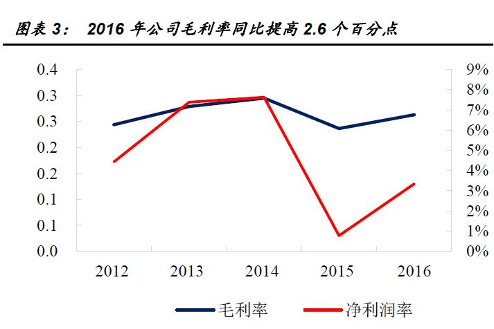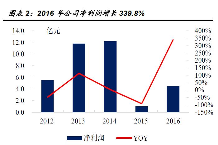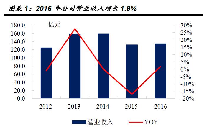 2016 年公司實現(xiàn)營收135.26 億元,同比增長1.92%;實現(xiàn)凈利潤4.52億元,同比增長340%;扣非后凈利潤4.64 億元,同比增長673%。每股收益0.30 元。