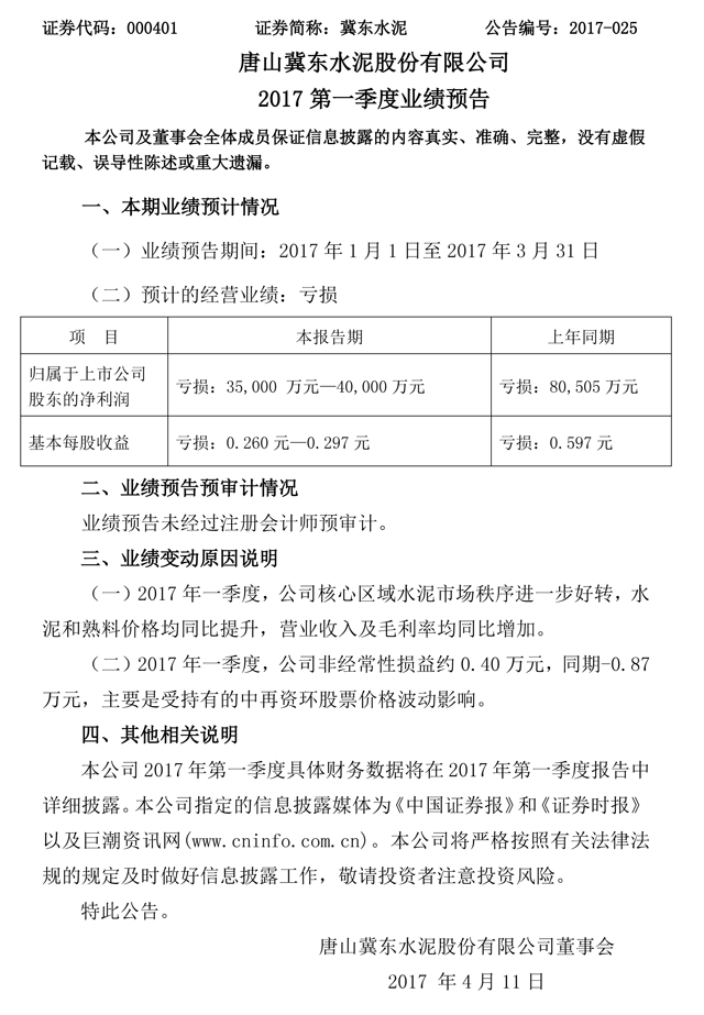 冀東水泥今日(4月12日)發(fā)布2017年一季度業(yè)績預告,預計公司2017年1-3月凈利潤為-4.00億元~-3.50億元,上年同期為-8.05億元,同比增長50.31%~56.52%。