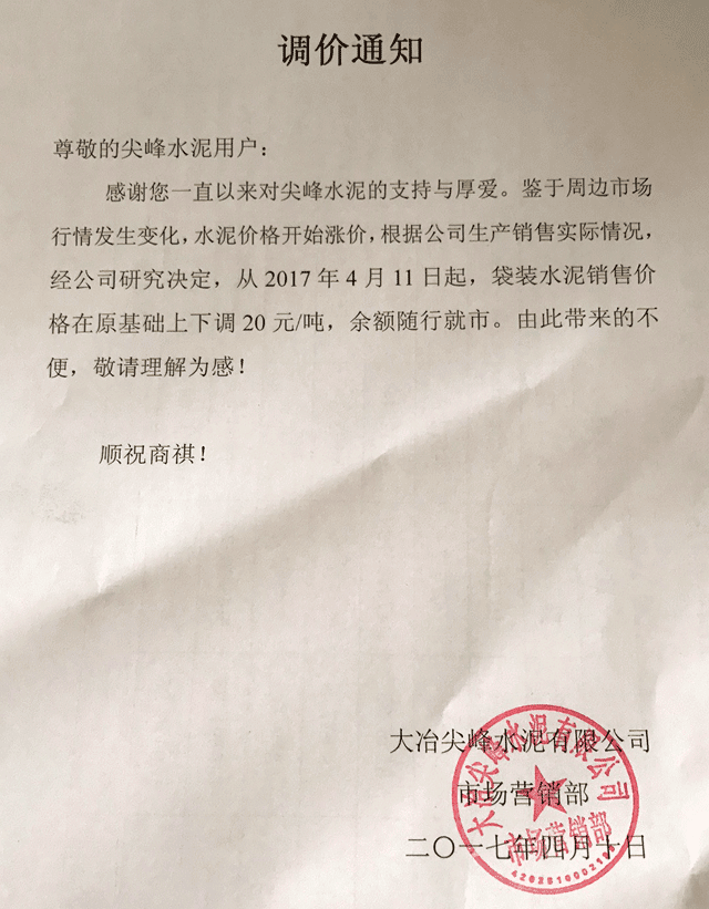 鑒于周邊市場行情發(fā)生變化 ,水泥價格開張上漲,根據公司生產銷售實際情況,經公司研究決定,從2017年4月11日起,袋裝水泥銷售價格在原基礎上下調20元,余額隨行就市。