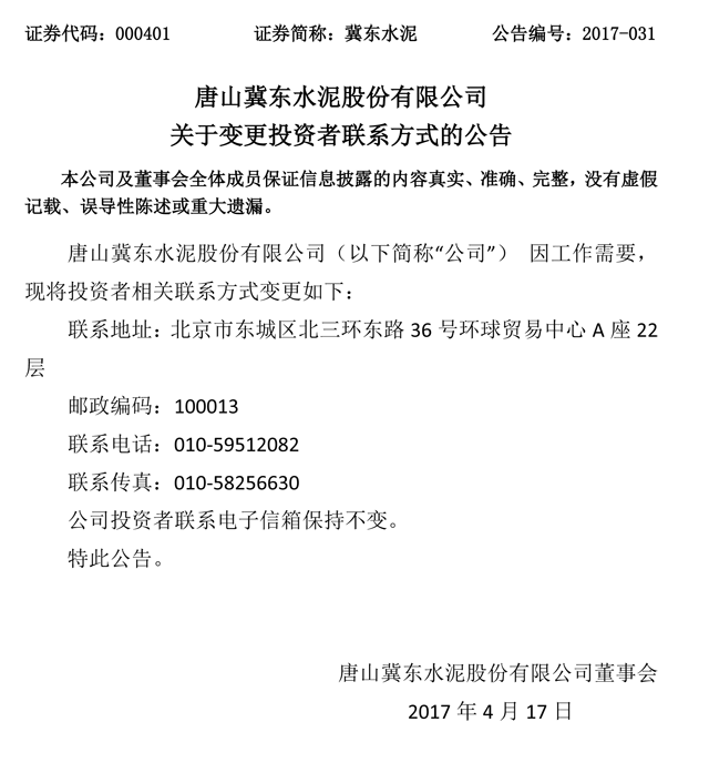 冀東水泥4月17日發(fā)布晚間公告稱,因工作需要,變更投資者相關(guān)聯(lián)系方式。公告原文如下:
