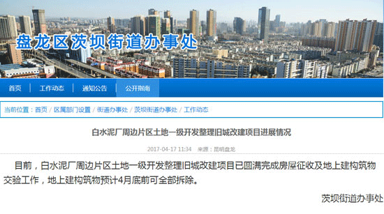 經(jīng)過近4個月的時間,白水泥廠項目土地一級開發(fā)整理工作顯然已經(jīng)取得明顯進(jìn)展。根據(jù)昆明盤龍區(qū)茨壩街道辦事處發(fā)布的消息,白水泥廠周邊片區(qū)土地一級開發(fā)整理舊城改建項目已經(jīng)完成了房屋征收及地上建構(gòu)筑物交驗工作,地上建構(gòu)筑物預(yù)計4月底前可全部拆除。也就是說,白水泥廠項目土地一級開發(fā)整理工作已經(jīng)進(jìn)入拆除階段,地上建筑物在4月底前可全部拆除。如無意外,地上建筑物拆除后,相繼的土地平整工作等也可展開,土地的出讓為時不遠(yuǎn)。