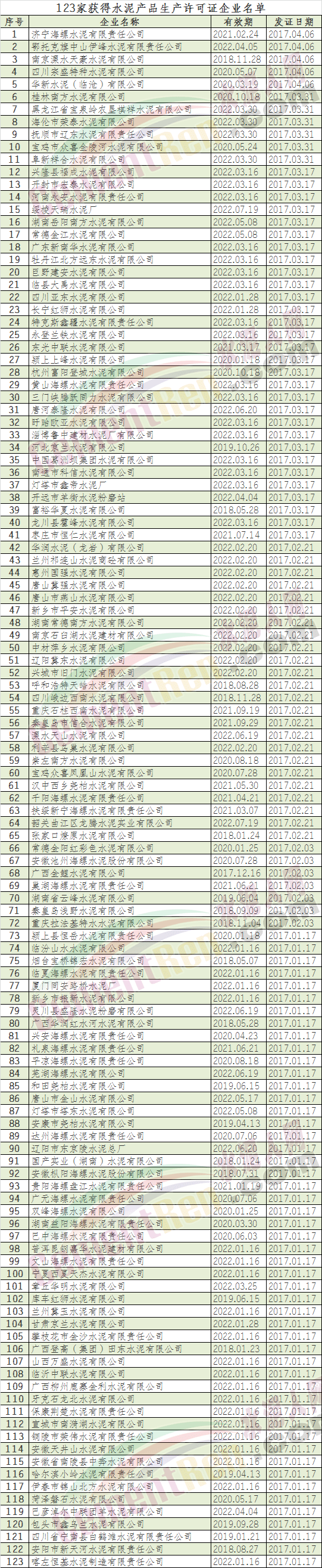 日前,國家質量監(jiān)督檢驗檢疫總局公布了2017年1月至4月獲證企業(yè)名單,水泥行業(yè)獲得水泥產品生產許可證的企業(yè)有123家,水泥人網匯總列表如下: