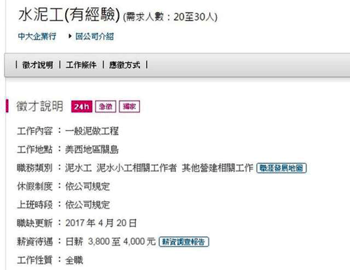 根據(jù)《中央社》報(bào)導(dǎo),征人的業(yè)者李先生說,關(guān)島當(dāng)?shù)赜袀€(gè)大學(xué)的新建大樓工程需要工人,因此想從臺(tái)灣招募工人過去,將應(yīng)征有經(jīng)驗(yàn)的水泥工20至30人。臺(tái)灣的水泥師傅日薪約在2000~3000元,一個(gè)月約賺6至7萬。