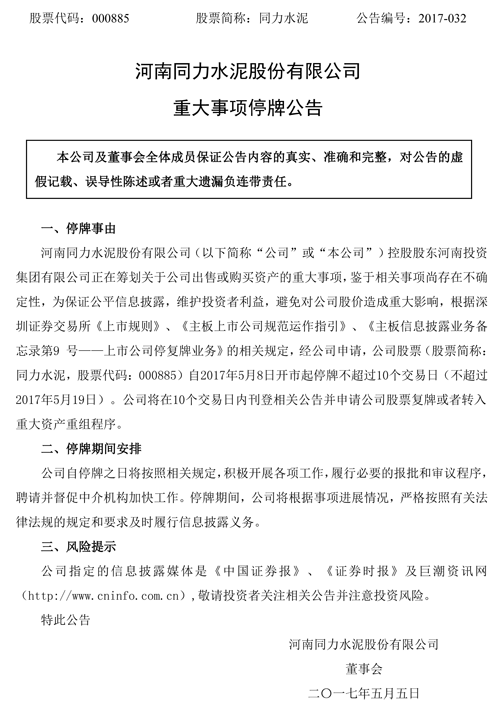 河南同力水泥股份有限公司(以下簡稱“公司”或“本公司”)控股股東河南投資集團有限公司正在籌劃關(guān)于公司出售或購買資產(chǎn)的重大事項,鑒于相關(guān)事項尚存在不確定性,為保證公平信息披露,維護(hù)投資者利益,避免對公司股價造成重大影響,根據(jù)深圳證券交易所《上市規(guī)則》、《主板上市公司規(guī)范運作指引》、《主板信息披露業(yè)務(wù)備忘錄第9 號——上市公司停復(fù)牌業(yè)務(wù)》的相關(guān)規(guī)定,經(jīng)公司申請,公司股票(股票簡稱:同力水泥,股票代碼:000885)自2017年5月8日開市起停牌不超過10個交易日(不超過2017年5月19日)。公司將在10個交易日內(nèi)刊登相關(guān)公告并申請公司股票復(fù)牌或者轉(zhuǎn)入重大資產(chǎn)重組程序。