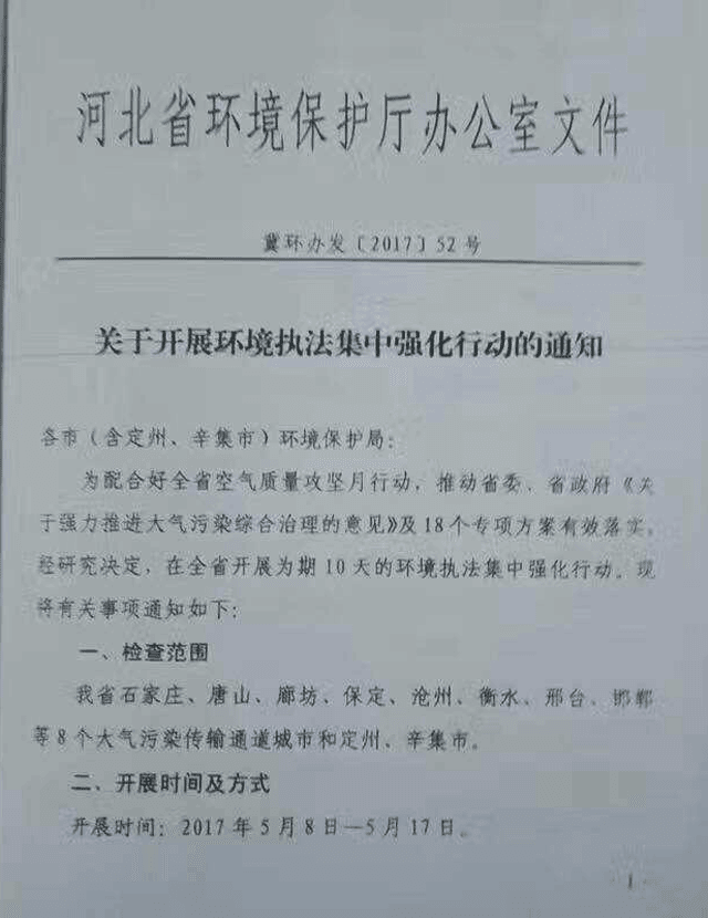 日前,河北省環(huán)境保護廳下發(fā)《關(guān)于開展環(huán)境執(zhí)法集中強化行動的通知》,通知要求唐山、廊坊、邢臺、邯鄲等8個大氣污染傳輸通道城市于2017年5月8日-5月17日,加大執(zhí)行力度,嚴厲查處大氣環(huán)境違法行為,重點行業(yè)為水泥等常年運行燃煤鍋爐等高架源,不能穩(wěn)定達標(biāo)排放企業(yè)一律停產(chǎn)整頓。
