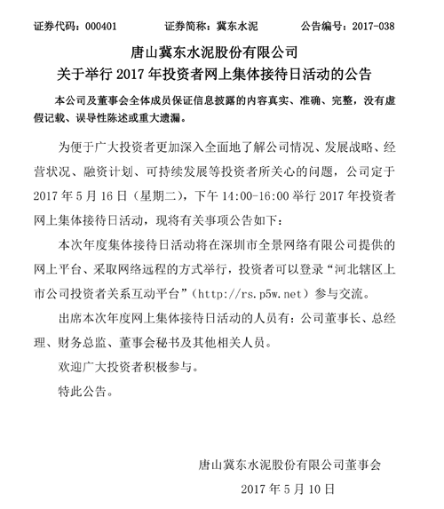 昨日(10日)晚間唐山冀東水泥股份有限公司發(fā)布關(guān)于舉行2017年投資者網(wǎng)上集體接待日活動(dòng)的公告稱:為便于廣大投資者更加深入全面地了解公司情況、發(fā)展戰(zhàn)略、經(jīng)營(yíng)狀況、融資計(jì)劃、可持續(xù)發(fā)展等投資者所關(guān)心的問(wèn)題,公司定于2017年5月16日(星期二),下午14:00-16:00舉行2017年投資者網(wǎng)上集體接待日活動(dòng)。
