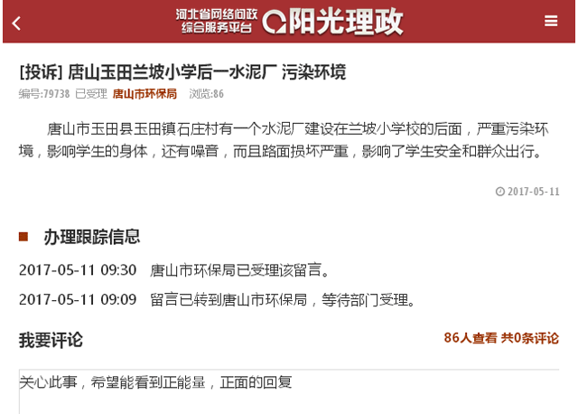 近日,河北省網(wǎng)絡(luò)問(wèn)政綜合服務(wù)平臺(tái),陽(yáng)光理政欄目接到投訴稱唐唐山市玉田縣玉田鎮(zhèn)石莊村有一個(gè)水泥廠建設(shè)在蘭坡小學(xué)校的后面,嚴(yán)重污染環(huán)境,影響學(xué)生的身體,還有噪音,而且路面損壞嚴(yán)重,影響了學(xué)生安全和群眾出行。今日09:09該留言已轉(zhuǎn)到唐山市環(huán)保局,09:30唐山市環(huán)保局已受理該留言。