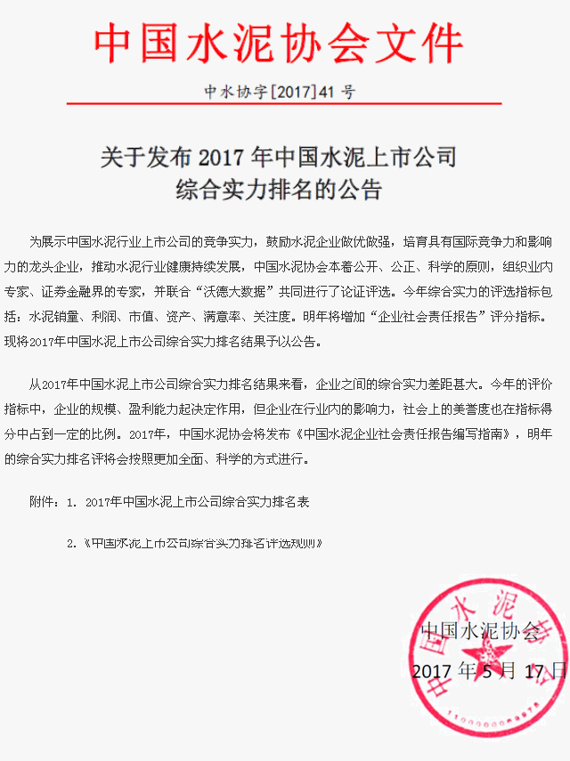 關于發(fā)布2017年中國水泥上市公司綜合實力排名的公告