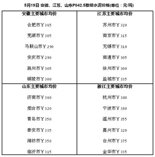 據(jù)了解,長三角沿江熟料價(jià)格上漲20元/噸,漲幅達(dá)到80-90元/噸,出廠價(jià)達(dá)320元/噸-340元/噸,這是今年來沿江熟料價(jià)格第四次漲價(jià)。此輪漲價(jià)在市場意料之外,明顯超預(yù)期。由于沿江熟料價(jià)格是華東地區(qū)水泥價(jià)格的風(fēng)向標(biāo),預(yù)計(jì)在今年6月淡季來臨前,安徽、山東、江蘇和浙江的水泥價(jià)格有望再跟隨熟料價(jià)格普漲一輪。水泥人網(wǎng)匯總了這些地區(qū)的最新價(jià)格,匯總?cè)缦拢?/p>