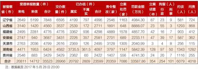 截至2017年5月28日20:00,共計受理舉報35523個(其中,來電舉報20811個,來信舉報14712個);經梳理分析并合并重復舉報,累計向被督察地方交辦有效舉報28966件。地方已辦結23599件,責令整改20359家,立案處罰7086家,共計罰款33587.86萬元;立案偵查354件,行政和刑事拘留355人,約談6079人,問責4018人(具體情況詳見附表)。