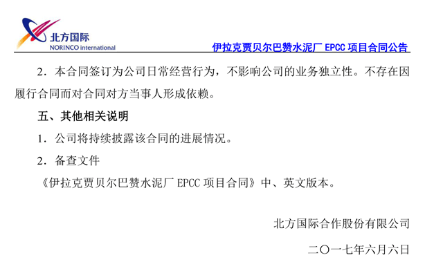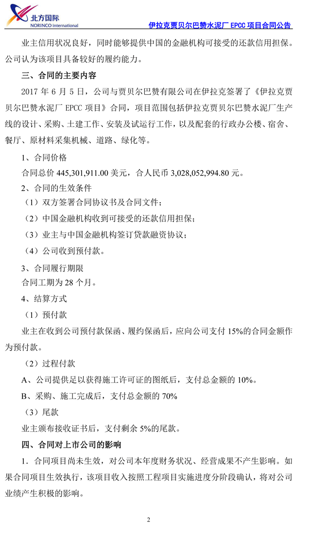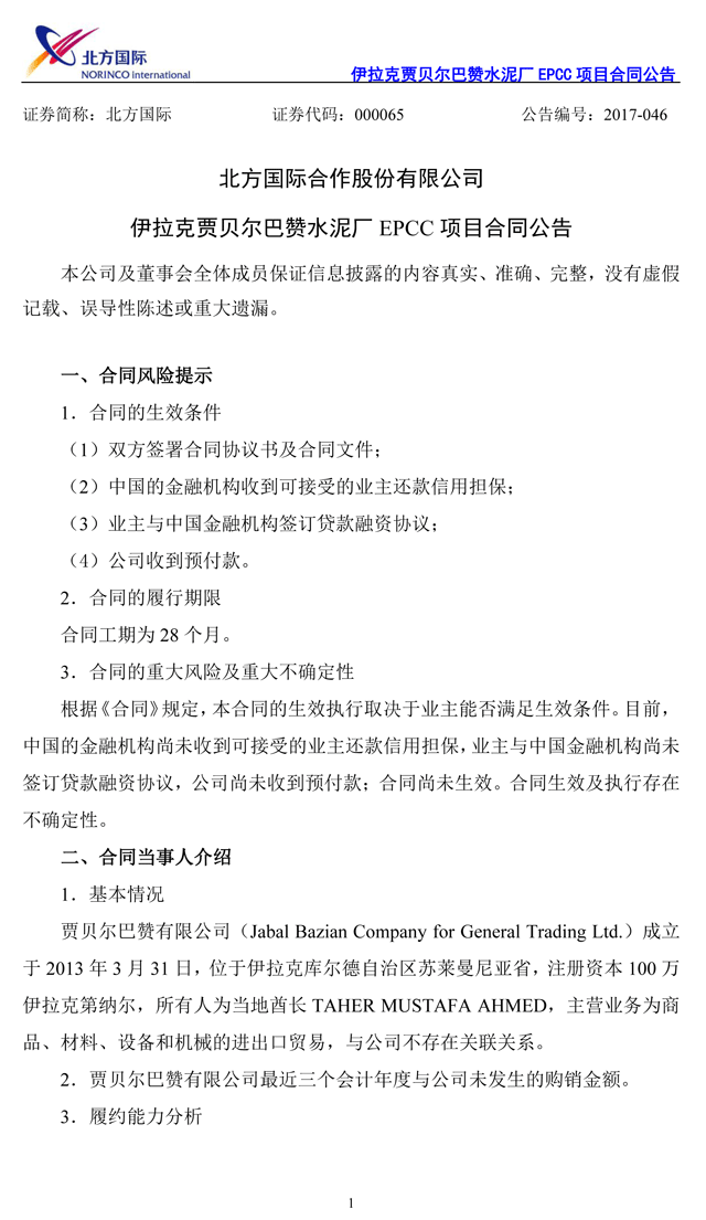 2017年6月5日,北方國際與賈貝爾巴贊有限公司在伊拉克簽署合同,項目范圍包括伊拉克賈貝爾巴贊水泥廠生產線的設計、采購、土建工作、安裝及試運行工作,以及配套的行政辦公樓、宿舍、餐廳、原材料采集機械、道路、綠化等。合同總價445,301,911.00美元,合人民幣3,028,052,994.80元。