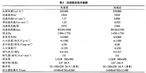 但我廠由于受場地限制,空間狹窄,無法采用第一種方案,只能采用第二種方案,即收塵器加高方案。改造后的技術(shù)參數(shù)見表3。