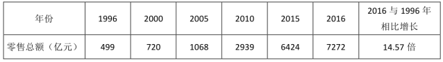 3、2016年社會(huì)消費(fèi)品零售總額是1996年的14.57倍。
