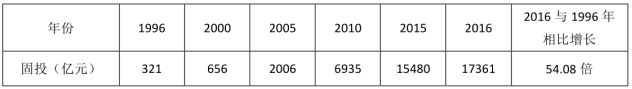 2、2016年全社會(huì)固定資產(chǎn)投資是1996年的54.13倍。